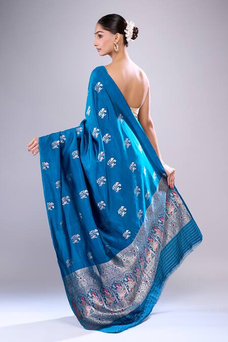 Buy_Mint N Oranges_Blue Silk Embroidery Bird Woven Butta Saree_Online_at_Aza_Fashions