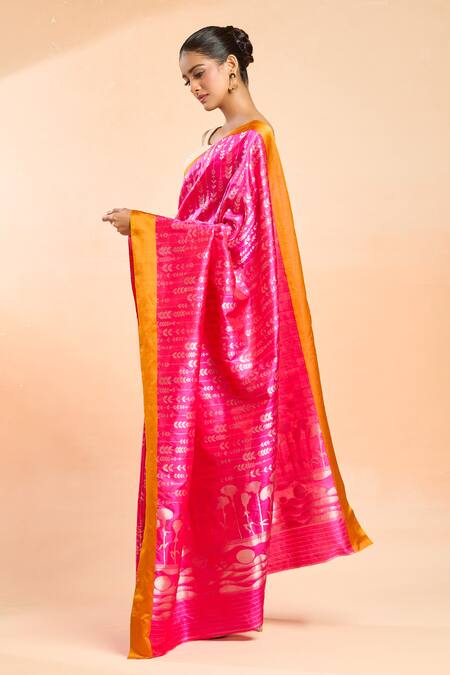 Pink banarasi silk saree featuring an all-over bloom vine woven detailing with a contrast orange border. Accompanied by an unstitched blouse piece.