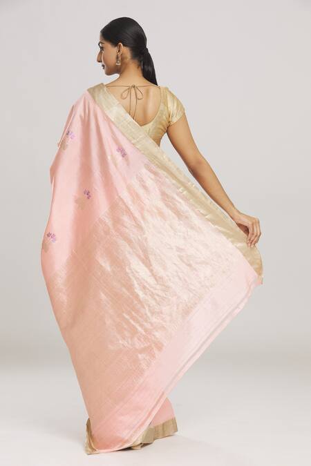 Peach handwoven pure banarasi silk saree featuring florin bloom woven detail. Comes with a running blouse piece.