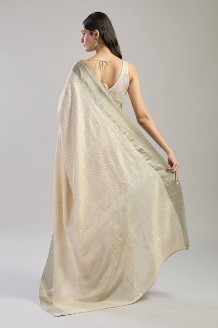 Beige hand woven saree featuring chikankari embroidery in floral & geometric pattern. Comes with an unstitched blouse piece.