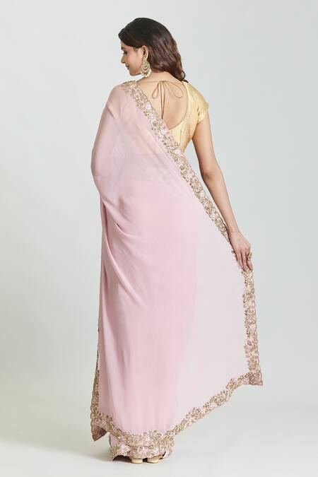 Baby pink saree made from pure georgette featuring floral zardozi embroidery along the borders