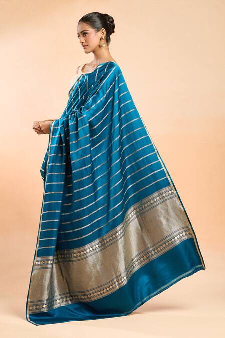 Buy_Mint N Oranges_Blue Satin, Silk Embroidery Floral Vine Woven Saree_Online_at_Aza_Fashions