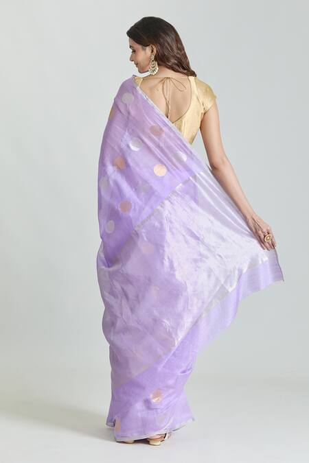 Purple handloom saree crafted in pure chanderi featuring all over woven polka and zari striped palla detailing. Comes with an unstitched blouse piece for customization.