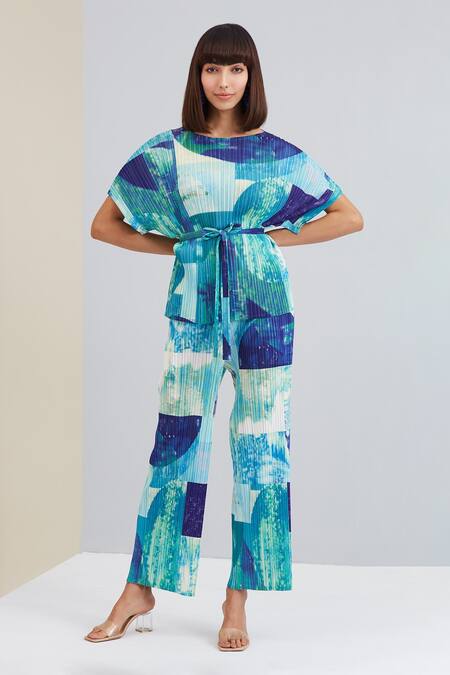 Blue abstract printed top with structured sleeves. Comes with co-ordinating pants and a separate fabric belt.