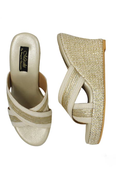 Gold and white wedges featuring open toe design with gota embroidery and cutout detailing