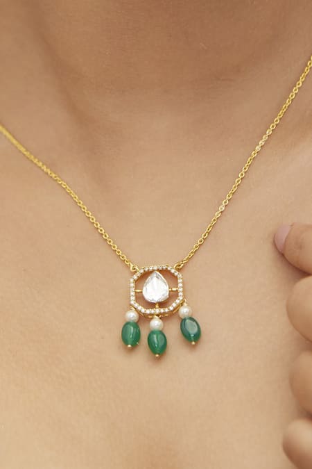 Moissanite polki stone studded pendant, Geometric pendant design, Green bead drops accenting the necklace