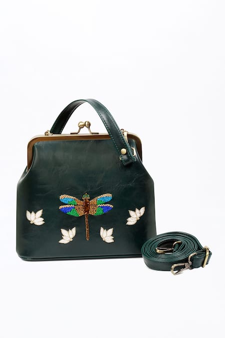 Green faux leather clutch featuring hand embroidered dragonfly design. Includes a detachable handle and sling chain for versatile carrying options.