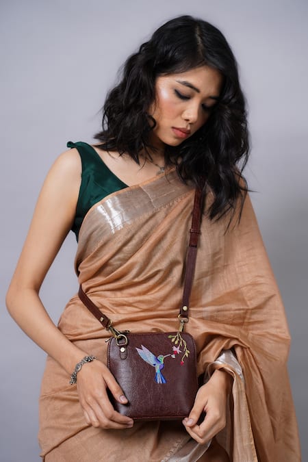 Dark brown faux leather sling bag featuring hand embroidered hummingbird design. Includes a shoulder sling strap for easy carrying.