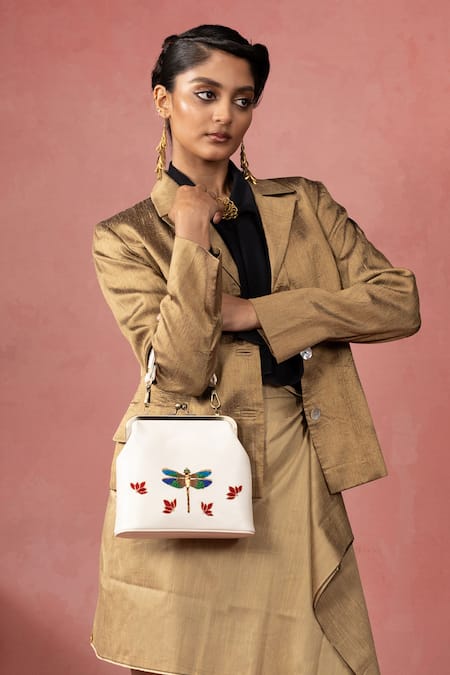 White Zari, Beads, Sequins Ivory Hand Embroidered Dragonfly Clutch