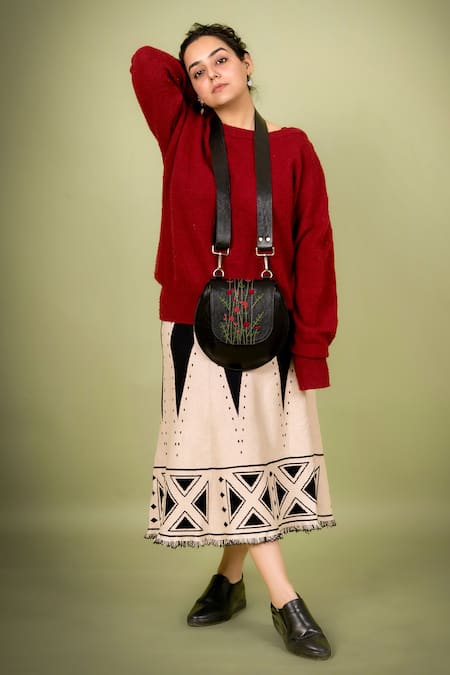 Black sling bag made of faux leather featuring embroidered red rosebud design