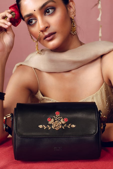 Black flap sling bag crafted from faux leather featuring hand embroidery with delicate roses in antique dabka work. Includes a sling chain for easy carrying.