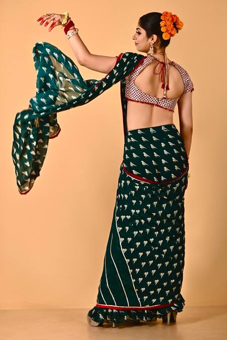 Bottal green pre-draped saree featuring hand embroidery and a contrasting maroon border. Paired with a padded raw silk blouse adorned with intricate detailing.