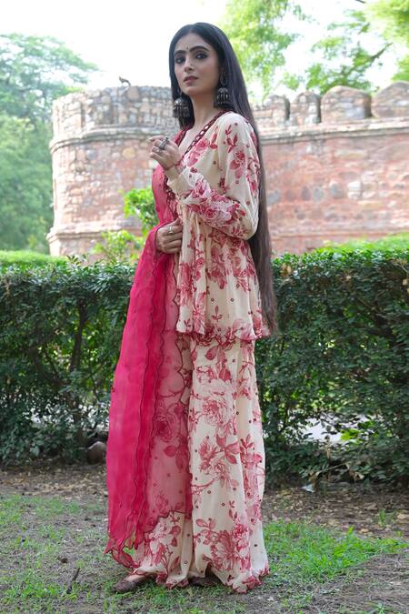 Off White Georgette, Silk Organza Floral Print Peplum Kurta Sharara Set