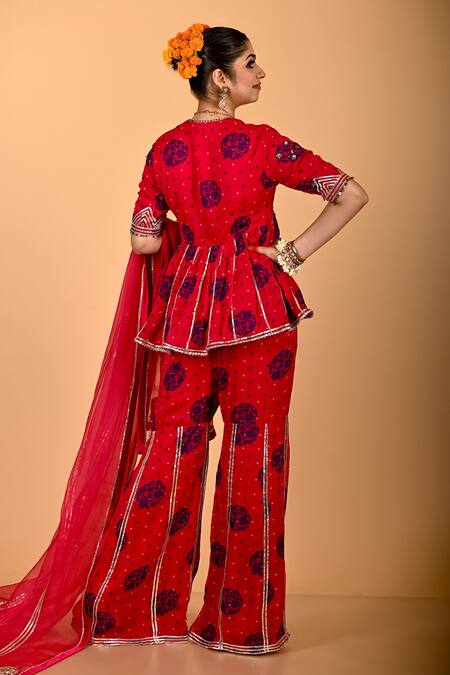 Fuschia pink peplum kurta featuring hand embroidery and a flared silhouette. Paired with a sharara and a silk organza dupatta.
