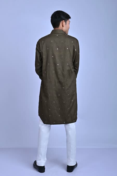 Green kurta featuring mirror and resham work with a mandarin collar and long sleeves. Paired with ivory cotton lycra straight pant.