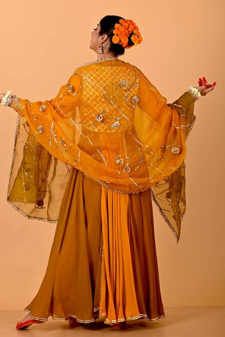 Mustard yellow Anarkali featuring hand embroidery and an attached lining. Paired with a pant and a dupatta crafted in silk organza.