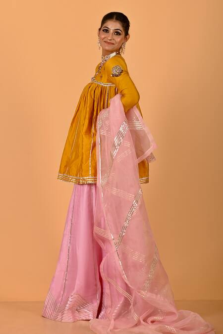 Mustard yellow peplum kurta featuring hand embroidery and an attached lining. Paired with a blush pink lehenga and a silk organza dupatta.