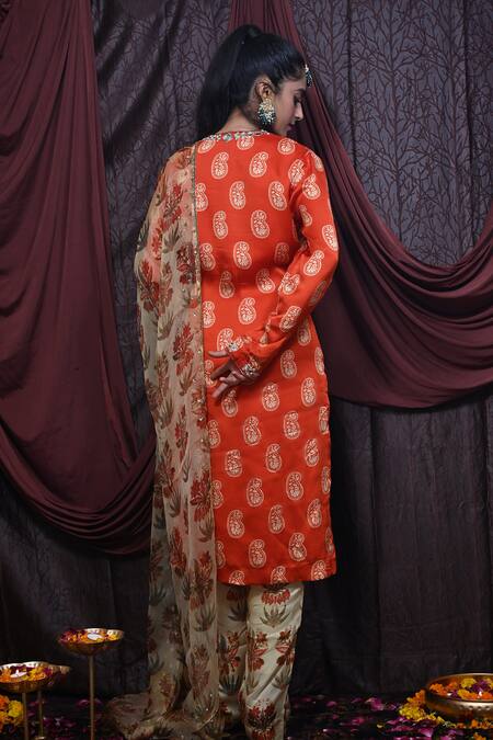 Orange kurta featuring a paisley printed base adorned with mirrorwork and bead embellishments. Paired with a contrast ivory printed pant and a silk organza dupatta.