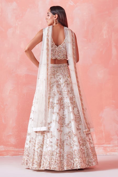Ivory lehenga with gold sequin and beads embellishment. Comes with sleeveless blouse and dupatta.