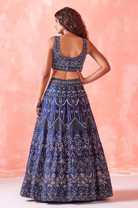 Dark blue lehenga with multicolor sequin and beads embellishment. Comes with sleeveless blouse and dupatta.