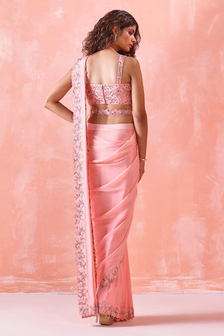 Buy_Mirroir_Peach Viscose Georgette, American Crepe, Lining Pre-draped Saree With Blouse _at_Aza_Fashions