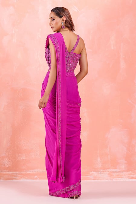 Candy pink pre-draped saree with embroidered border. Comes with sleeveless blouse and belt.