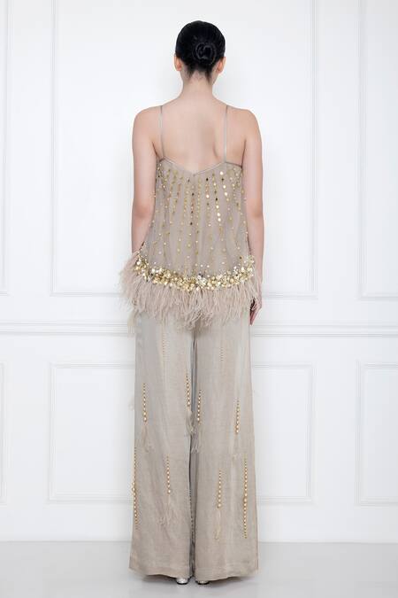 Grey spaghetti camisole top embellished with mirror, pearl & feathers.