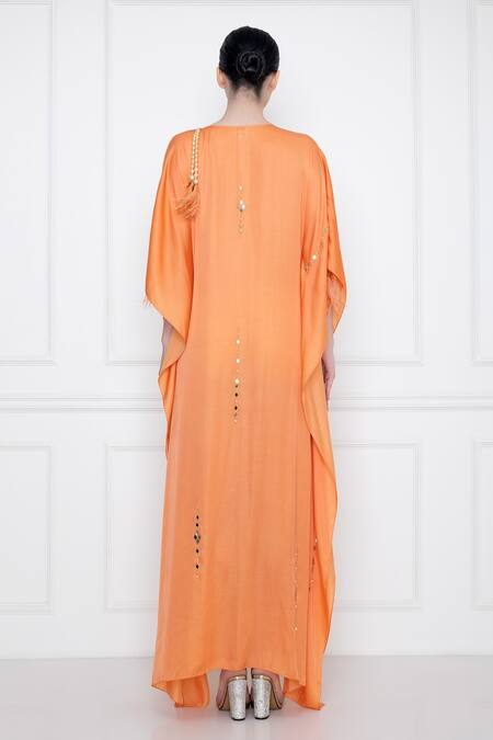 Buy_Dilnaz_Orange Cotton Satin Mirror, Pearls Plunge V Neck Embellished Kaftan_at_Aza_Fashions
