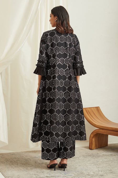 Black long jacket with all-over mirror work, ruffle trim at the sleeve hems and slit in front.