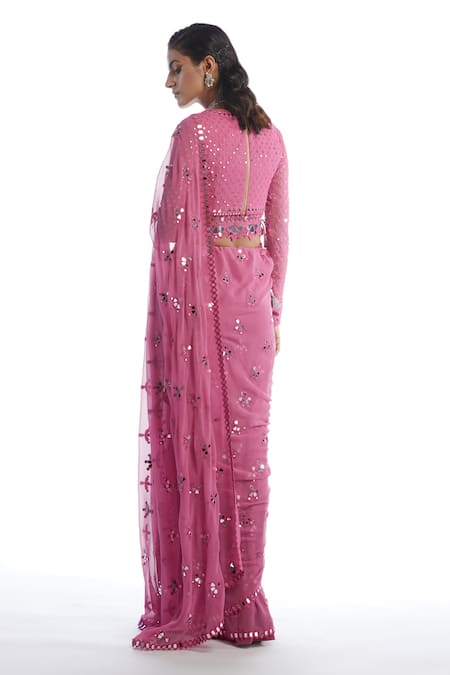 Pink Georgette V Neck Mirror Embellished Saree With Blouse