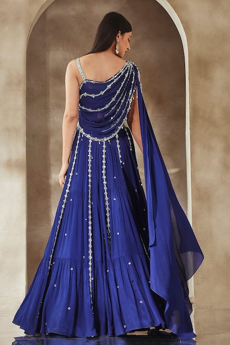 Electric blue chiffon lehenga featuring floral embroidery with mirror work detailing. Paired with an asymmetric draped embroidered blouse and tassel detailing.