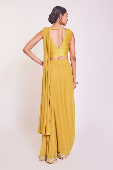 Shop_Onaya_Yellow Lycra Mirror And Cutdana Leaf Neck Embroidered Pre-draped Saree With Blouse_Online_at_Aza_Fashions