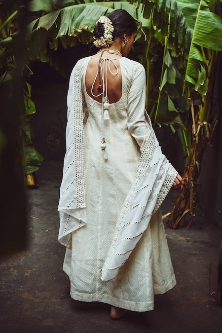 Off white anarkali with chevron pattern and buttoned cuffs. Comes with cotton pants and embellished dupatta.