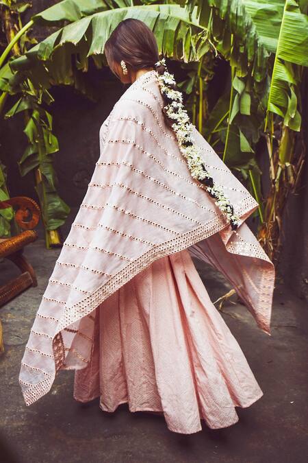 Light pink anarkali with chevron pattern and buttoned cuffs. Comes with cotton pants and embellished dupatta.