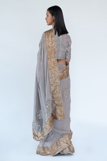 Grey saree crafted in georgette base, highlighted with mirror embellished floral patchwork and contrast gold border. Comes with V neck mirror and floral pattern blouse.