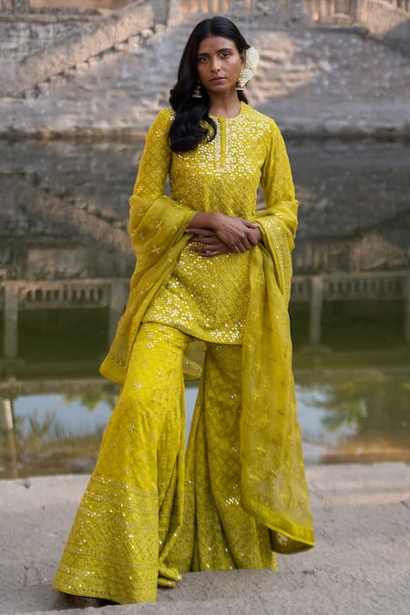 Mustard kurta with mirror embroidery & round neck. Paired with mirror work sharara & dupatta.