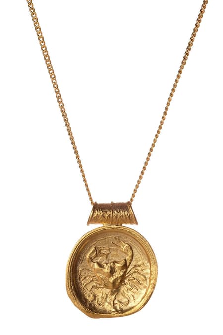 Gold pendant necklace featuring a carved cancer medallion handcrafted in brass metal. The chain is adjustable with lengths at 40cm, 45cm, and 50cm.