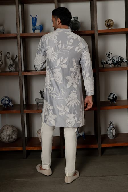 A cloudy blue Chanderi kurta featuring intricate white floral embroidery and a band collar. It is paired with cotton lycra pants.