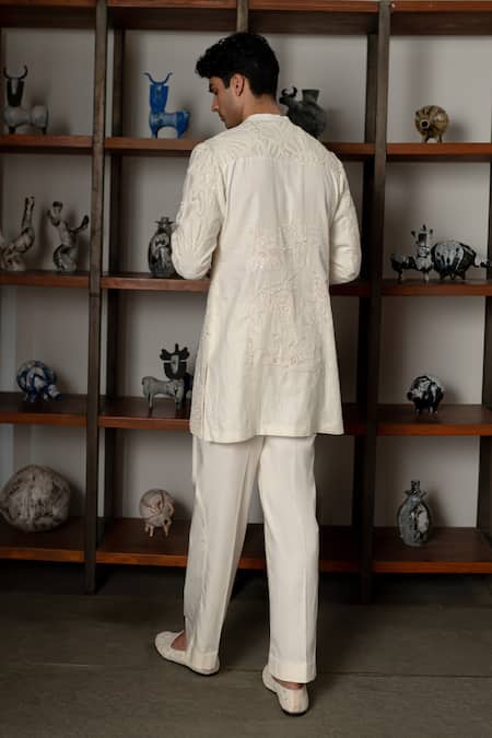 An ivory Chanderi kurta featuring intricate embroidery. It is paired with coordinating ivory cotton lycra pants.