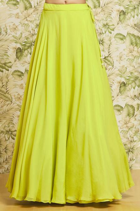 Lime green lehenga featuring an attached cancan with a length of 45 inches. Paired with a sleeveless blouse in Chanderi and an open cape in Organza, both adorned with abstract embroidery, sequins, and French knots.