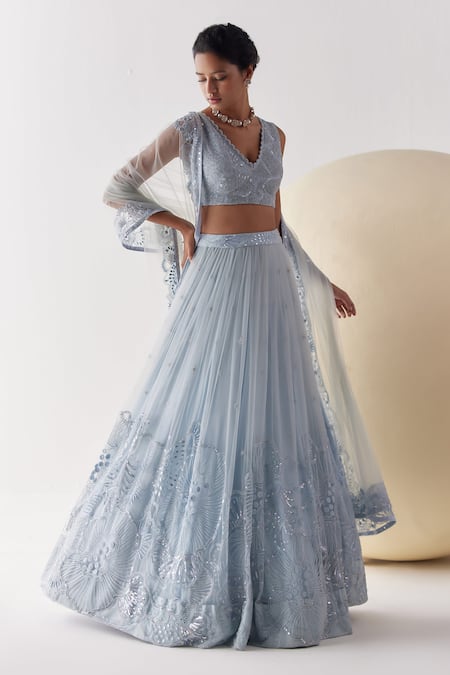 Cloudy blue lehenga featuring all over cosmati florin embroidery with tonal sequins, beads & mirror highlights. Paired with a padded V neck blouse and embellished border dupatta.
