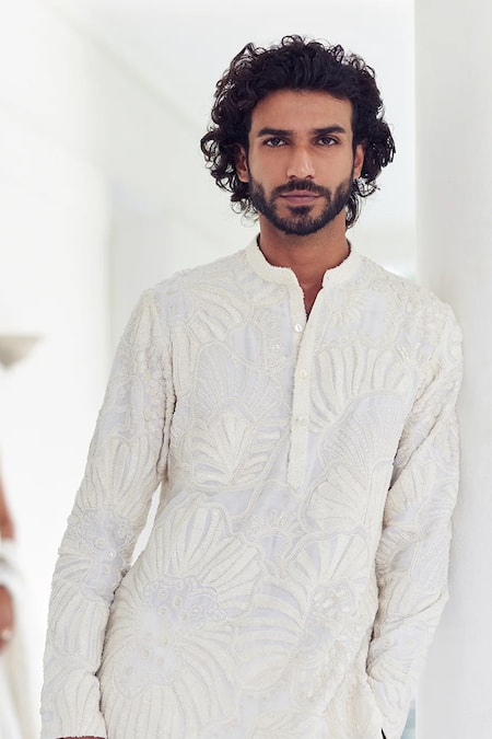 An ivory chanderi kurta featuring intricate embroidery and a band collar. Paired with ivory cotton lycra pants.
