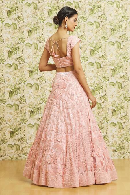 Pink lehenga featuring floral applique, sequin, thread, and bead embroidery. Paired with a cap sleeve embroidered blouse and a cutwork embroidered sheer dupatta.