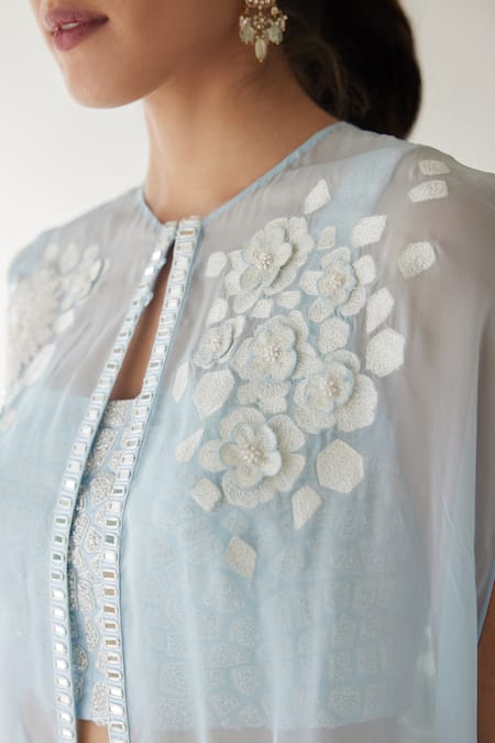Cloudy blue cape featuring floral bunches embroidery and an asymmetric hem. Paired with a hexagon embroidered padded crop top and flared organza pant.