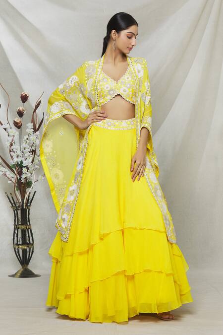 Yellow open front cape with mirror, thread and sequin embroidery in a floral pattern. Comes with sleeveless blouse and tiered lehenga.