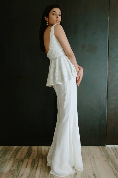 White Georgette Notched Square Hand Embroidered Top With Flared Pant