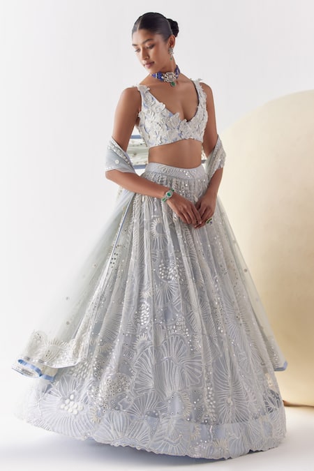 Grey Soft Tulle Embroidery 3d Flora Deep V Kai Onyx Bloom Bridal Lehenga Set