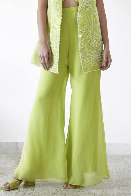 Lime green blazer featuring peak lapel and sleeveless design with sea coral embroidery. Paired with a padded inner waistcoat and high waisted flared pant.