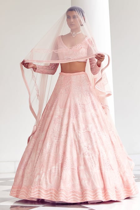 Baby pink lehenga featuring ionic blossom embroidery with tonal sequins, beads & mirror highlights. Paired with a V neck padded blouse and a cut work detail embellished dupatta.