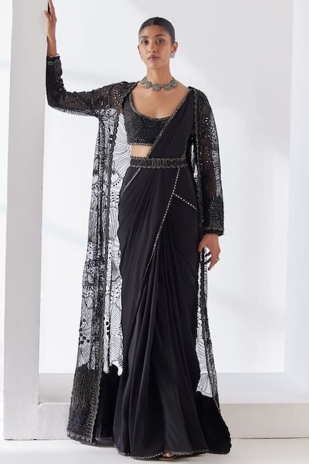 Black jacket featuring long sleeves and celeste nightfall embroidery with tonal sequins, beads, and mirror highlights. Paired with a pre-draped crepe saree and padded blouse embellished with mirror borders and a hand embroidered belt.